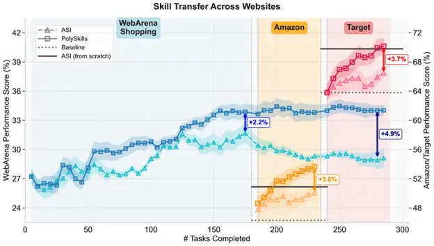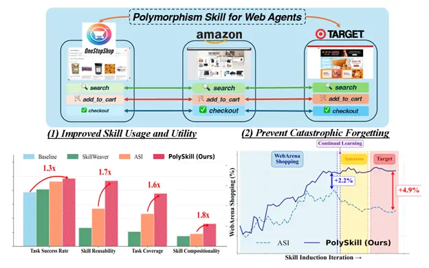 When PolySkill agents learn skills for new websites, they don’t “forget” how to use old ones. The abstract structure protects existing knowledge while adding new implementations.